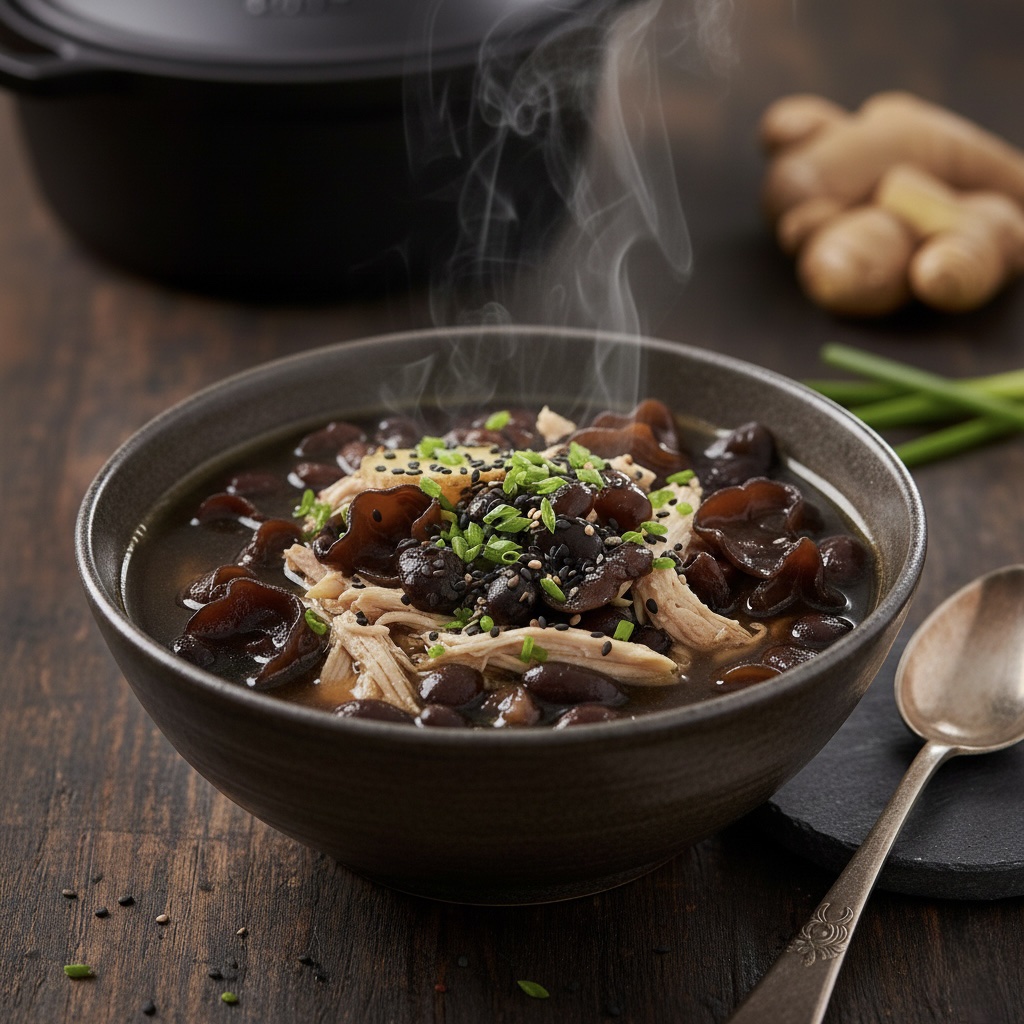 • 材料:黒豆(蒸し黒豆でもOK)、きくらげ、生姜、鶏肉(または豆腐)。