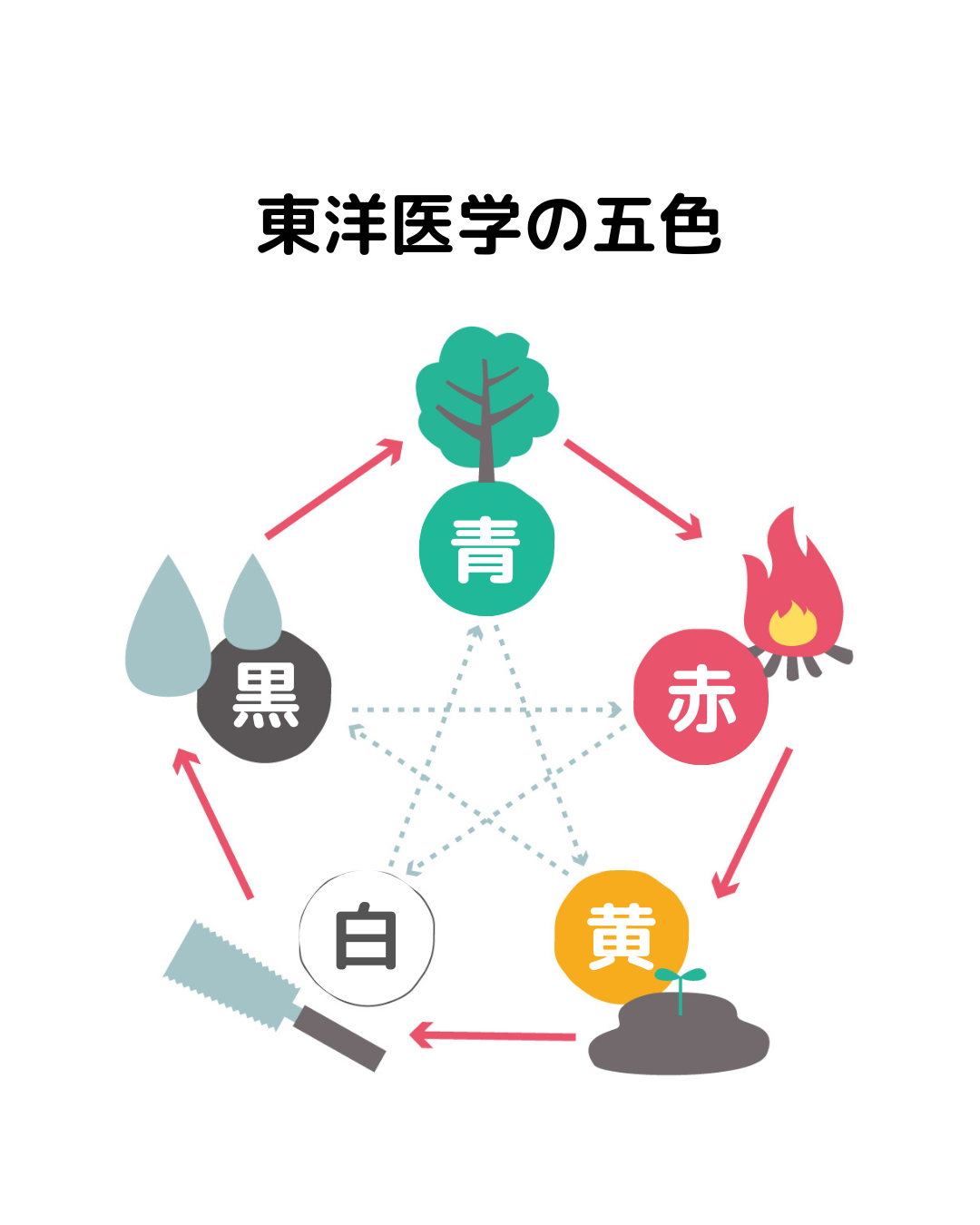 この5色(青・赤・黄・白・黒)というのは、東洋医学の五行説(自然界のあらゆるものは5つの要素から成るという考え)に出てくる色です。
